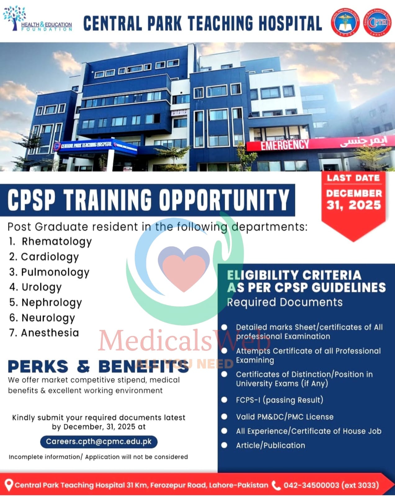 CPSP FCPS Training Opportunity, Central Park Teaching Hospital Lahore. Apply Now for Postgraduate FCPS Residency Jan 2026.