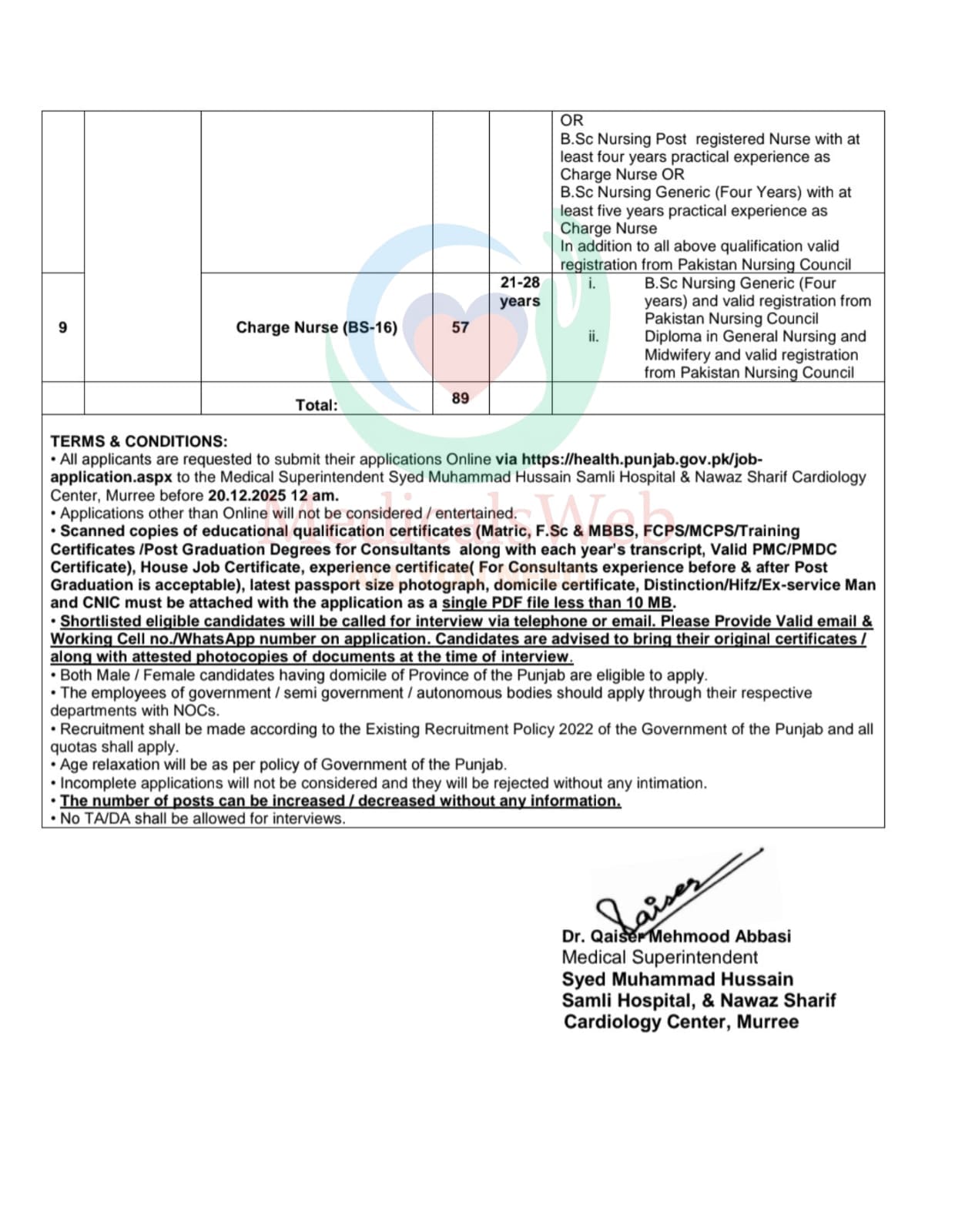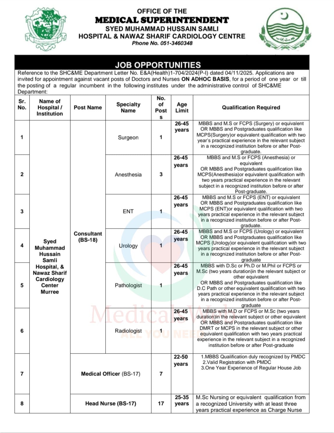 📌 Jobs Opportunities – Syed Muhammad Hussain Samli Hospital & Nawaz Sharif Cardiology Center, Murree