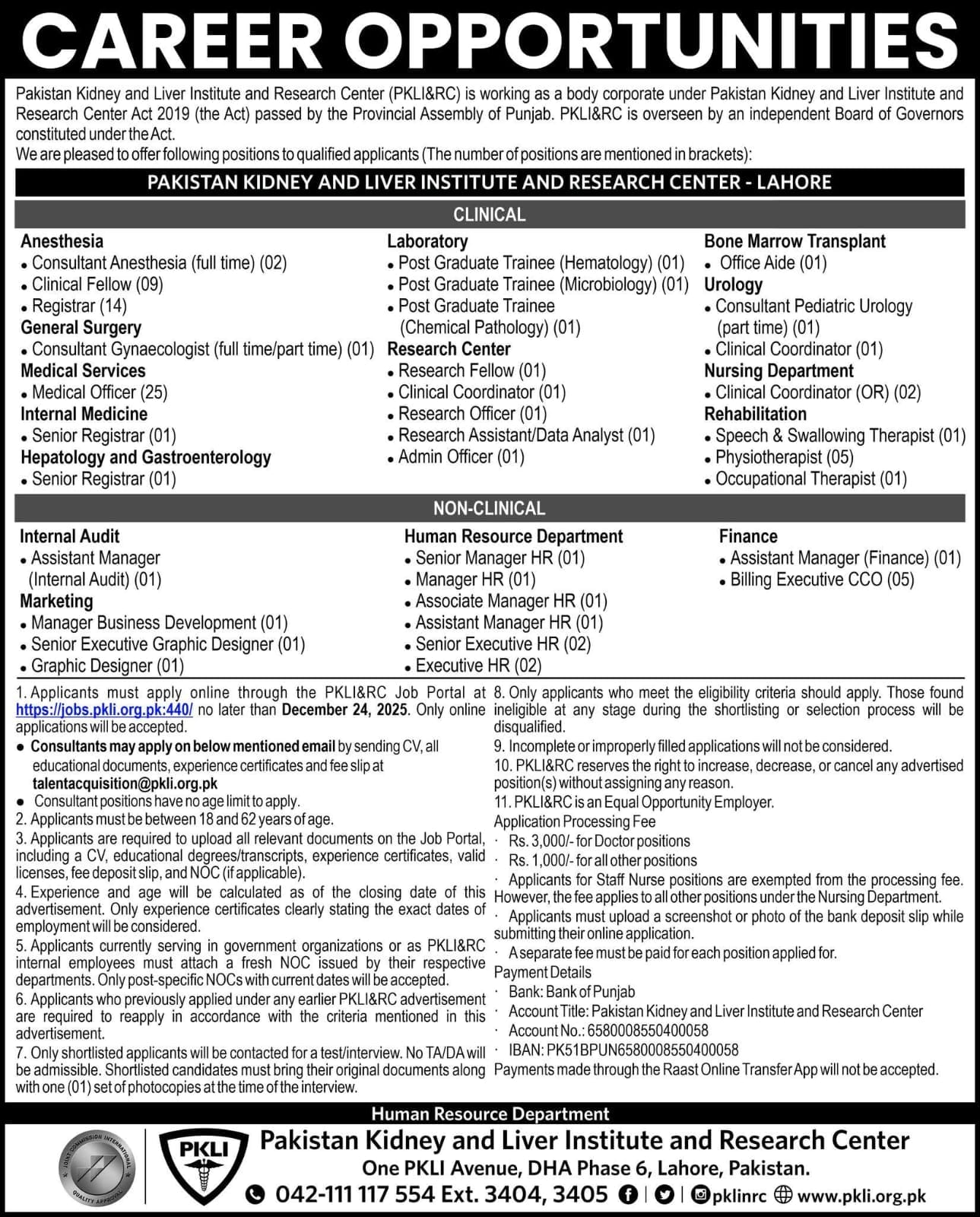 Pakistan Kidney and Liver Institute & Research Center (PKLI&RC) invites qualified professionals to apply for a wide range of jobs positions. Operating under the PKLI&RC Act 2019 and guided by an independent Board of Governors, the institute combines modern facilities with a strong focus on patient-centered care. As a result, PKLI&RC offers meaningful career paths for clinicians, researchers, therapists and administrative experts.
